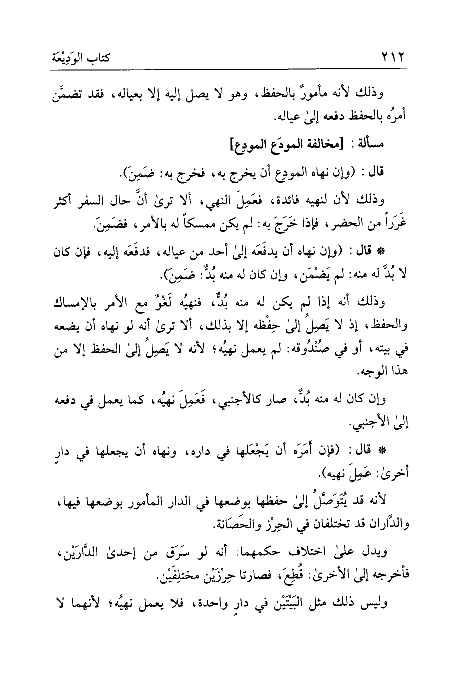 قال:"وإن نهاه المودع أن يخرج به، فخرج به: ضمن".