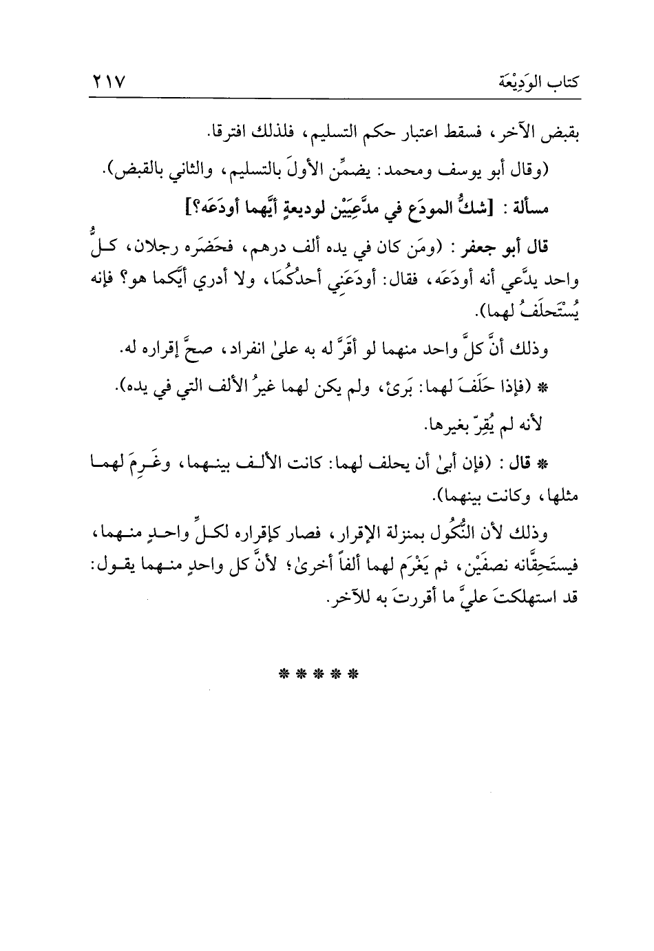 قال أبو جعفر:"ومن كان في يده ألف درهم، فحضره رجلان، كل واحد يدعي أنه أودعه، فقال: أودعني أحدكما، ولا أدري أيكما هو؟ فإنه يستخلف لهما".