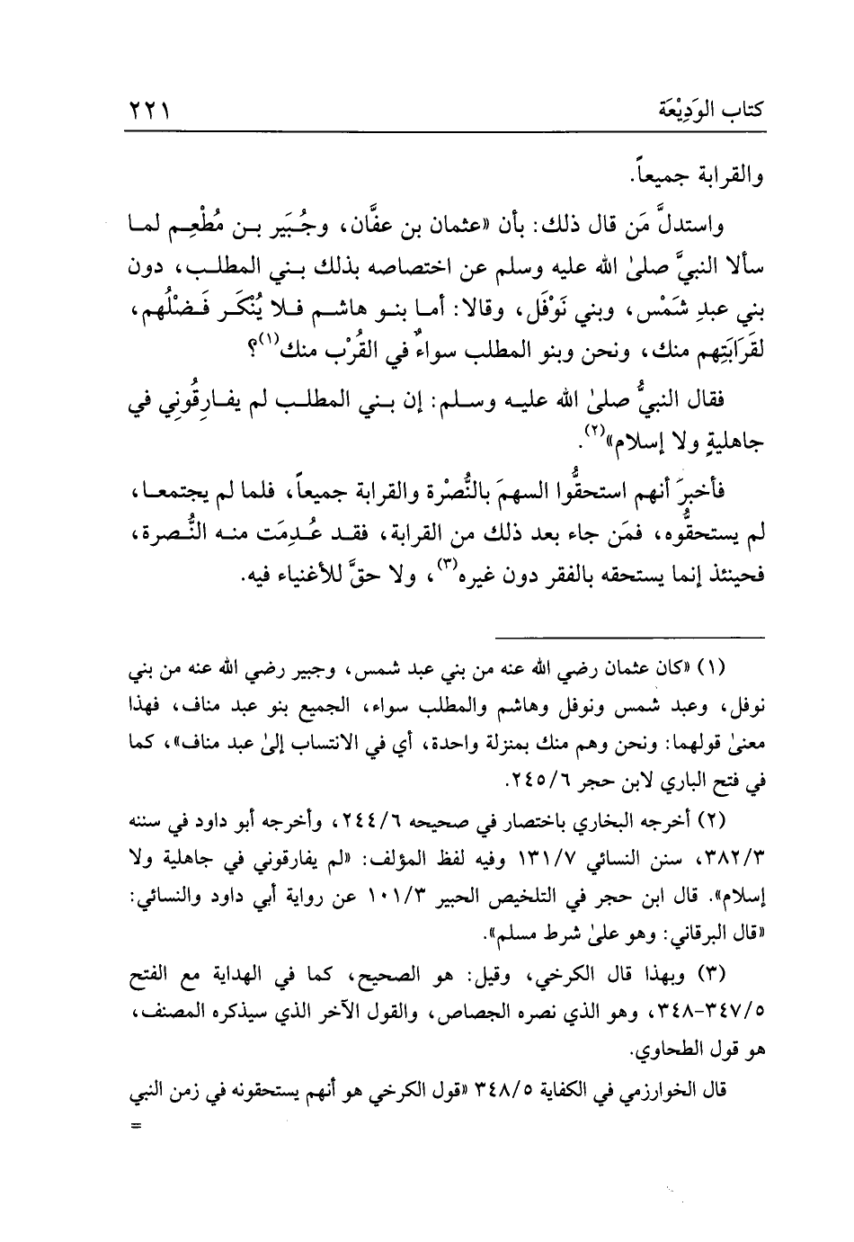 واستدل من قال ذلك: بأن "عثمان بن عفان , وجبير بن مطعم لما سألا النبي صلى الله عليه وسلم عن اختصاصه بذلك بني المطلب, دون بني عبد شمس, وبني نوفل, وقالا: أما بنو هاشم فلا ينكر فضلهم, لقرابتهم منك, ونحن وبنو المطلب سواء في القرب منك؟