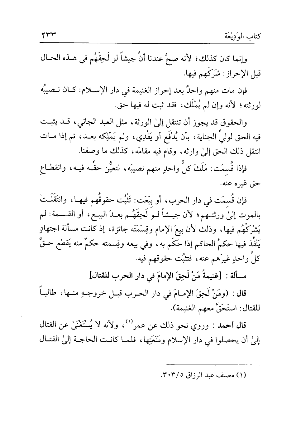 فإن مات منهم واحد بعد إحراز الغنيمة في دار الإسلام: كان نصيبه لورثته؛ لأنه وإن لم يملك، فقد ثبت له فيها حق.