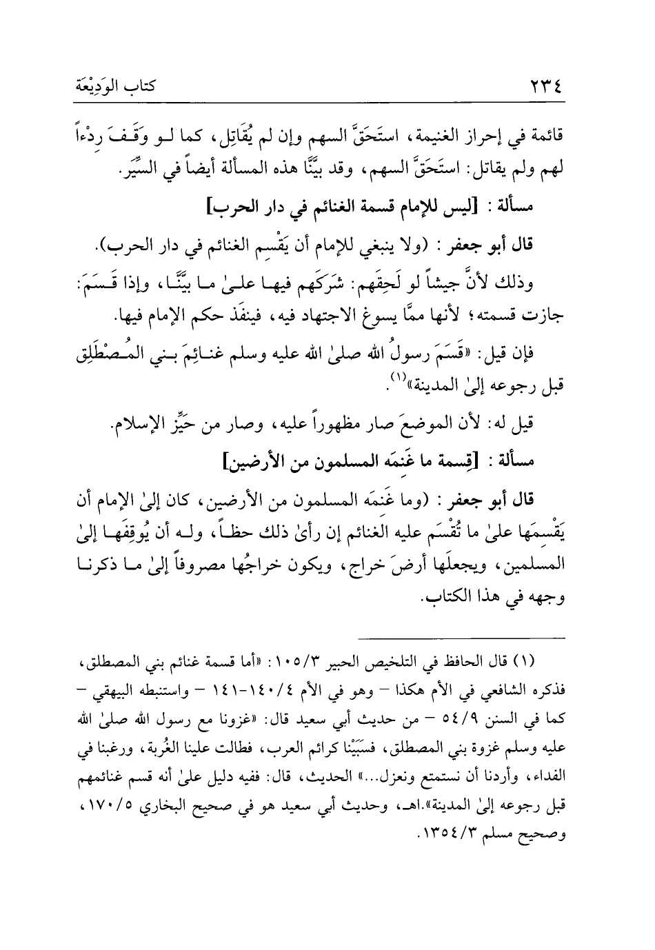 قال أبو جعفر: (وما غنمه المسلمون من الأرضين، كان إلى الإمام أن يقسمها على ما تقسم عليه الغنائم إن رأى ذلك حظا، وله أن يوفقها إلى المسلمين، ويجعلها أرض خراج، ويكون خراجها مصروفا إلى ما ذكرنا وجهه في هذا الكتاب.