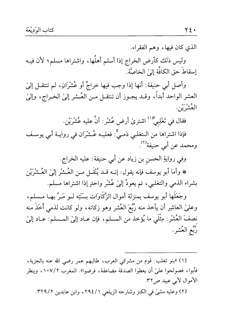 وجعلها أبو يوسف بمنزلة أموال الزكاوات بسنته، لو مر بها مسلم، وعلى العاشر أن يأخذ منه ربع العشر وهو زكاته، ولو كانت لذمي أخذ منه نصف العشر: مثلي ما يؤخذ من المسلم، فإن عاد إلى المسلم: عاد إلى ربع العشر.