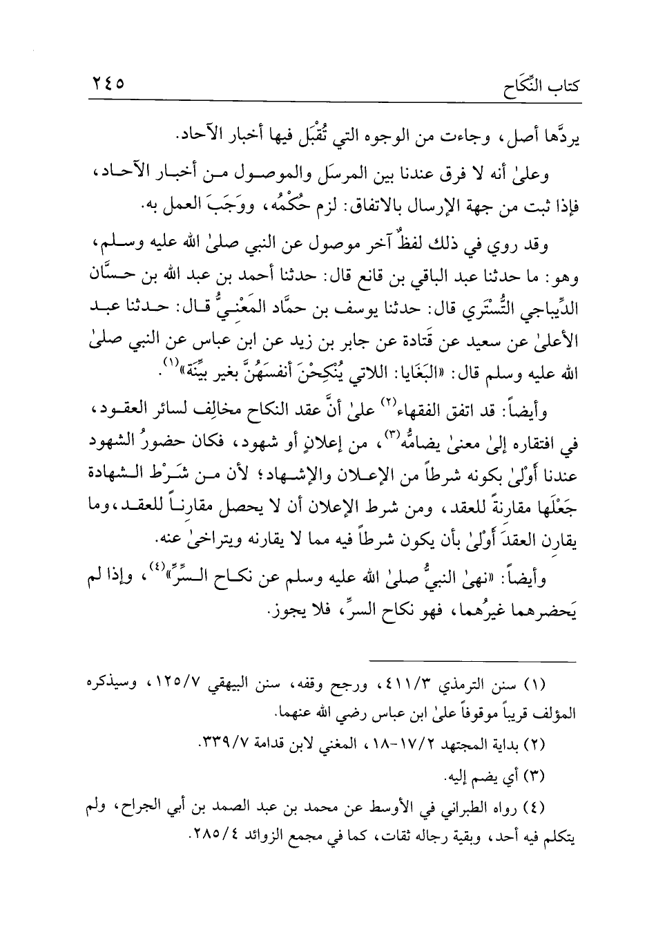 وأيضًا قد اتفق الفقهاء على أن عقد النكاح مخالف لسائر العقود، في افتقاره إلى معنى يضامه، من إعلان أو شهود، فكان حضور الشهود عندنا أولى بكونه شرطًا من الإعلان والإشهاد؛ لأن من شرط الشهادة جعلها مقارنة للعقد، ومن شرط الإعلان أن لا يحصل مقارنًا للعقد، وما يقارن العقد أولى بأن يكون شرطًا فيه مما لا يقارنه ويتراخى عنه.