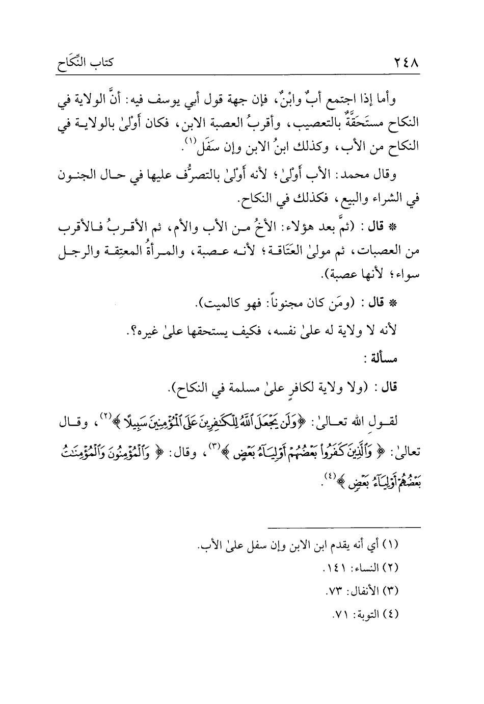 وأما إذا اجتمع أب وابن، فإن جهة قول أبي يوسف فيه: أن الولاية في النكاح مستحقة بالتعصيب، وأقرب العصبة الابن، فكان أولى بالولاية في النكاح من الأب، وكذلك ابن الابن وإن سفل.