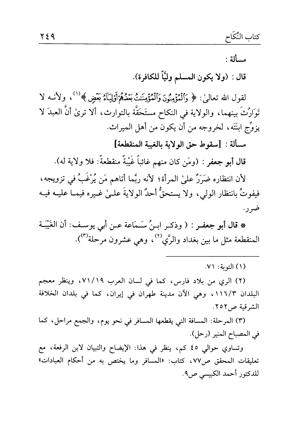 * قال جعفر: (وذكر ابن سماعة عن أبي يوسف: أن الغيبة المنقطعة مثل ما بين بغداد والري، وهي عشرون مرحلة).