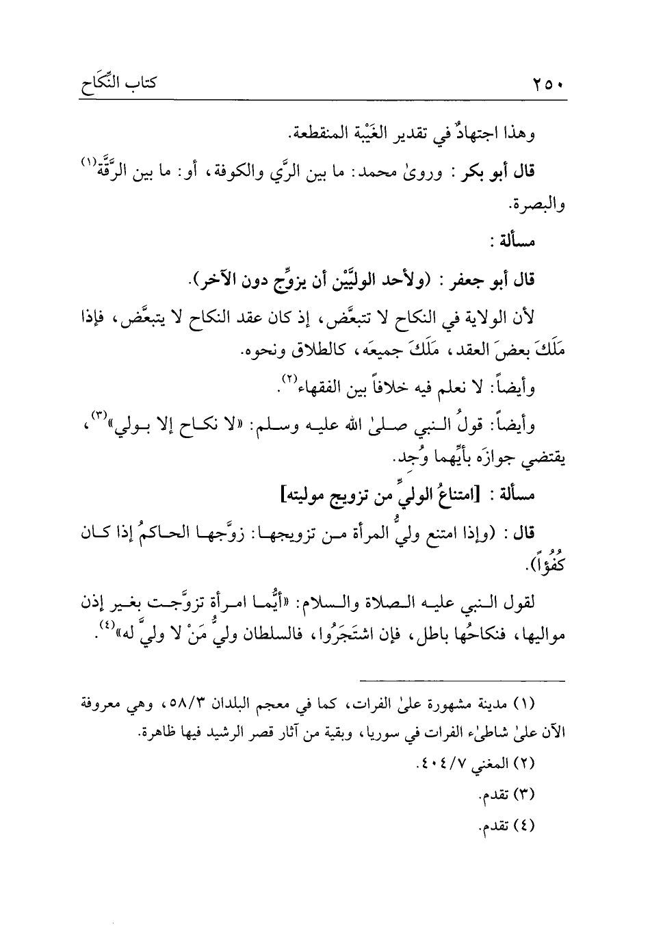 قال أبو جعفر: (ولأحد الوليين أن يزوج دون الآخر).
