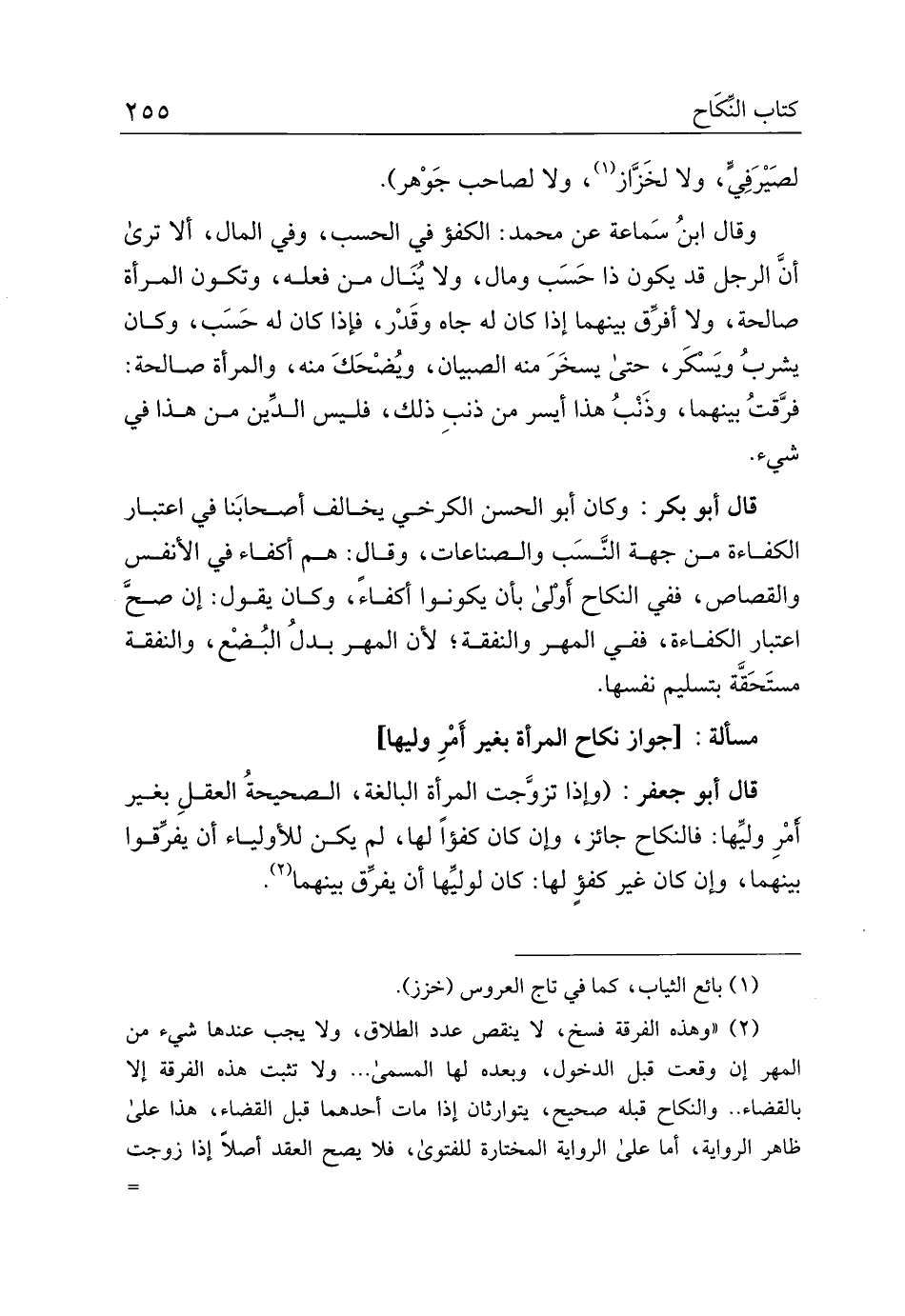 قال أبو جعفر: (وإذا تزوجت المرأة البالغة، الصحيحة العقل بغير أمر وليها: فالنكاح جائز، وإن كان كفؤًا لها، لم يكن للأولياء أن يفرقوا بينهما، وإن كان غير كفؤ لها: كان لوليها أن يفرق بينهما.