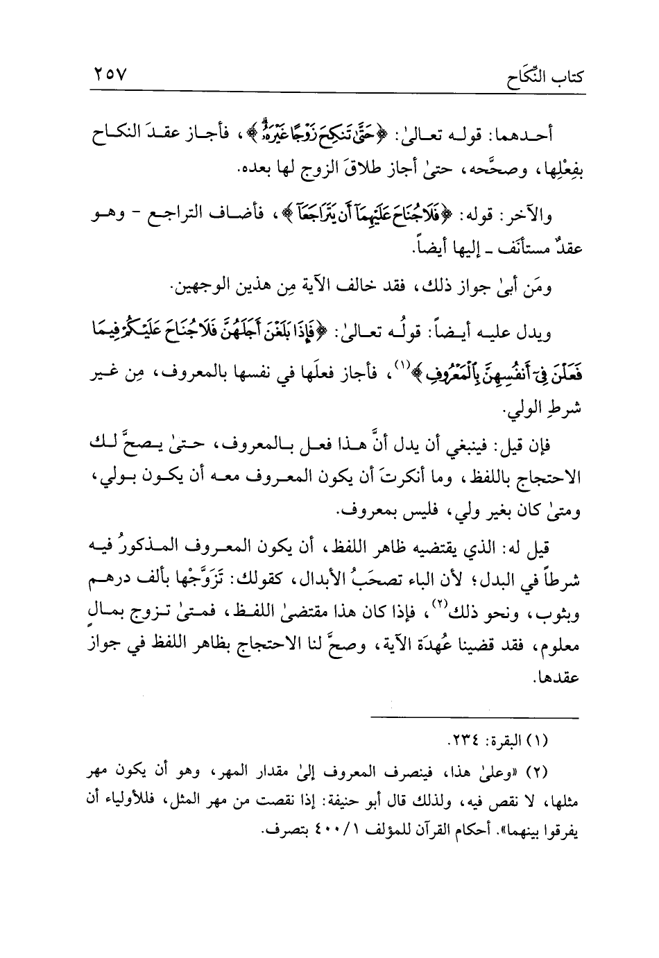 قيل له: الذي يقتضيه ظاهر اللفظ، أن يكون المعروف المذكور فيه شرطًا في البدل؛ لأن الباء تصحب الأبدال، كقولك: تزوجها بألف درهم وبثوب، ونحو ذلك، فإذا كان هذا مقتضى اللفظ، فمتى تزوج بمال معلوم، فقد قضينا عهدة الآية، وصح لنا الاحتجاج بظاهر اللفظ في جواز عقدها.
