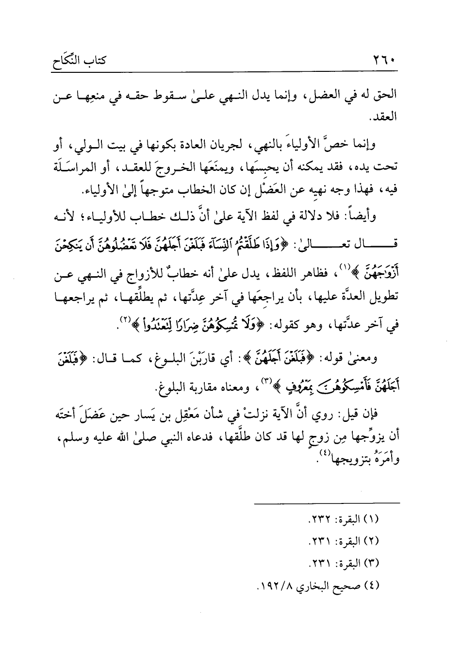 وأيضًا: فلا دلالة في لفظ الآية على أن ذلك خطاب للأولياء، لأنه قال تعالى: {وإذا طلقتم النساء فبلغن أجلهن فلا تعضلوهن أن ينكحن أزواجهن}، فظاهر اللفظ، يدل على أنه خطاب للأزواج في النهي عن تطويل العدة عليها، بأن يراجعها في آخر عدتها، ثم يطلقها، ثم يراجعها في آخر عدتها، وهو كقوله: {ولا تمسكوهن ضرارًا لتعتدوا}.