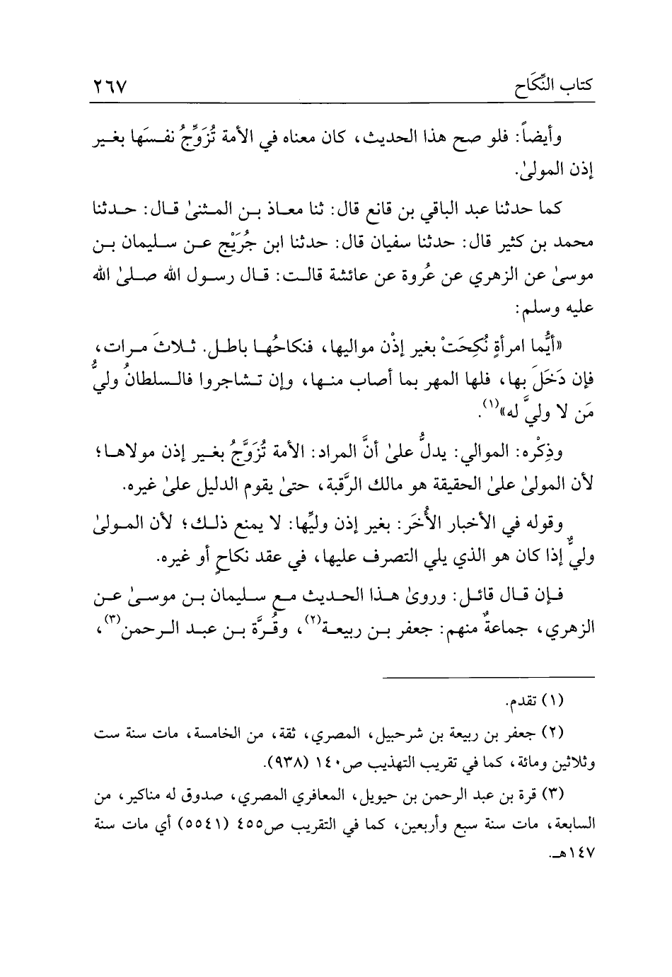فإن قال قائل: وروى هذا الحديث مع سليمان بن موسى عن الزهري، جماعة منهم: جعفر بن ربيعة، وقرة بن عبد الرحمن،
