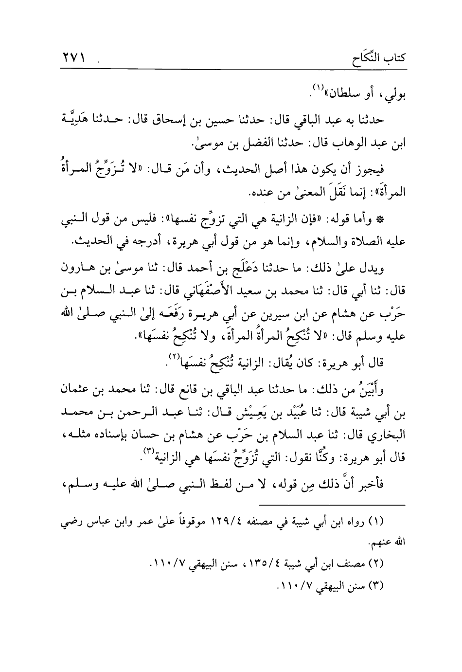 وأبين من ذلك: ما حدثنا عبد الباقي بن قانع قال: ثنا محمد بن عثمان بن أبي شيبة قال: ثنا عبيد بن يعيش قال: ثنا عبد الرحمن بن محمد البخاري قال: ثنا عبد السلام بن حرب عن هشام بن حسان بإسناده مثله، قال أبو هريرة: وكنا نقول: التي تزوج نفسها هي الزانية.