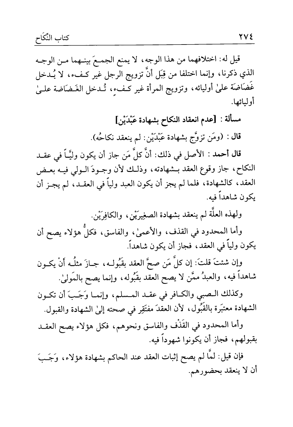 قال أحمد: الأصل في ذلك: أن كل من جاز أن يكون وليًا في عقد النكاح، جاز وقوع العقد بشهادته، وذلك لأن وجود الولي فيه بعض العقد، كالشهادة، فلما لم يجز أن يكون العبد وليًا في العقد، لم يجز أن يكون شاهدًا فيه.