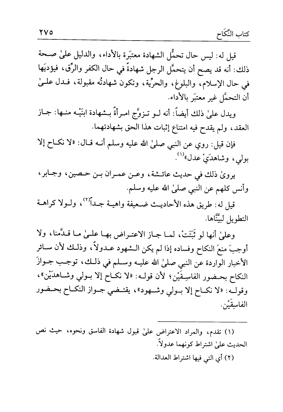 وعلى أنها لو ثبتت، لما جاز الاعتراض بها على ما قدمنا، ولا أوجب منع النكاح وفساده إذا لم يكن الشهود عدولاً، وذلك لأن سائر الأخبار الواردة عن النبي صلى الله عليه وسلم في ذلك، توجب جواز النكاح بحضور الفاسقين؛ لأن قوله: "لا نكاح إلا بولي وشاهدين"، وقوله: "لا نكاح إلا بولي وشهود"، يقتضي جواز النكاح بحضور الفاسقين.