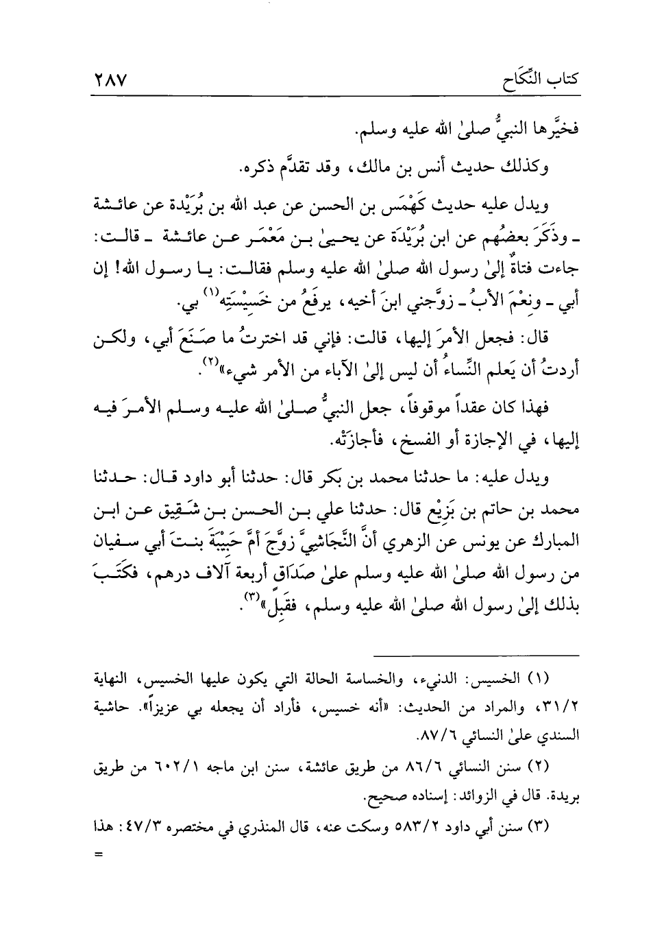 ويدل عليه حديث كهمس بن الحسن عن عبد الله بن بريدة عن عائشة - وذكر بعضهم عن ابن بريدة عن يحيى بن معمر عن عائشة – قالت: جاءت فتاة إلى رسول الله صلى الله عليه وسلم فقالت: يا رسول الله! إن أبي – ونعم الأب – زوجنى ابن أخيه، يرفع من خسيسته بي.