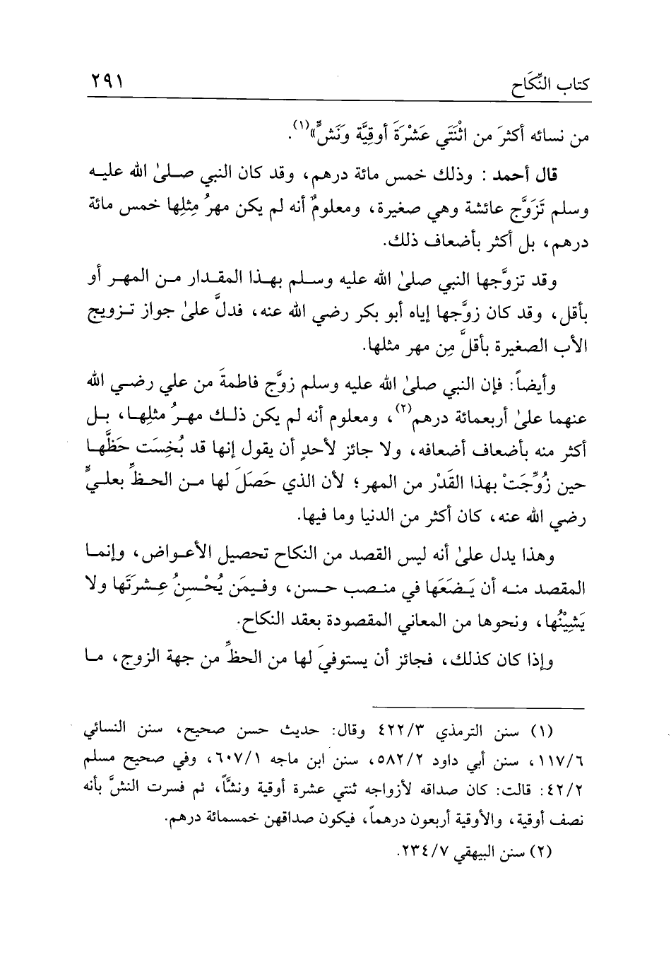 قال أحمد: وذلك خمس مائة درهم، وقد كان النبي صلى الله علي وسلم تزوج عائشة وهي صغيرة، ومعلوم أنه لم يكن مهر مثلها خمس مائة درهم، بل أكثر بأضعاف ذلك.
