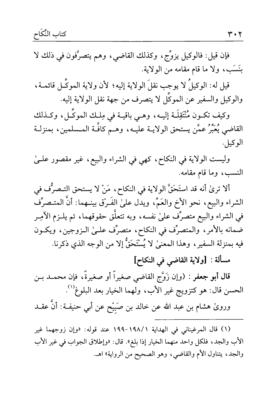 ألا ترى أنه قد استحق الولاية في النكاح، من لا يستحق التصرف في الشراء والبيع، نحو الأخ والعم، ويدل على الفرق بينهما: أن المتصرف في الشراء والبيع متصرف على نفسه، وبه تتعلق حقوقهما، ثم يلزم الآمر ضمانه بالأمر، والمتصرف في النكاح، متصرف على الزوجين، ويكون فيه بمنزلة السفير، وهذا المعنى لا يستحق إلا من الوجه الذي ذكرنا.