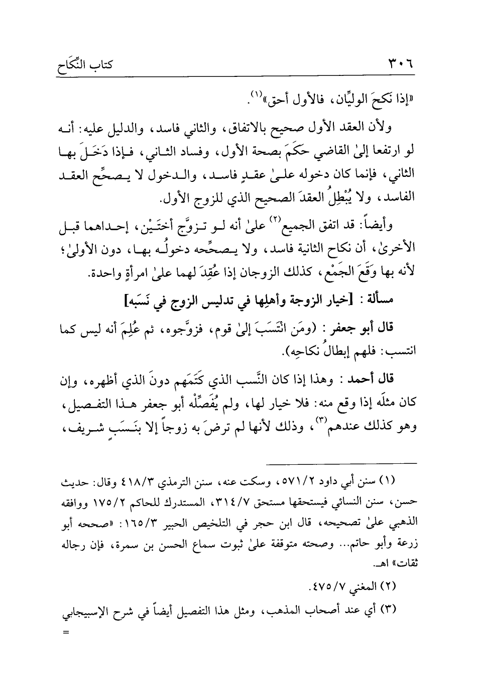 قال أحمد: وهذا إذا كان النسب الذي كتمهم دون الذي أظهره، وإن كان مثله إذا وقع منه: فلا خيار لها، ولم يفصله أبو جعفر هذا التفصيل، وهو كذلك عندهم، وذلك لأنها لم ترض به زوجًا إلا بنسب شريف،