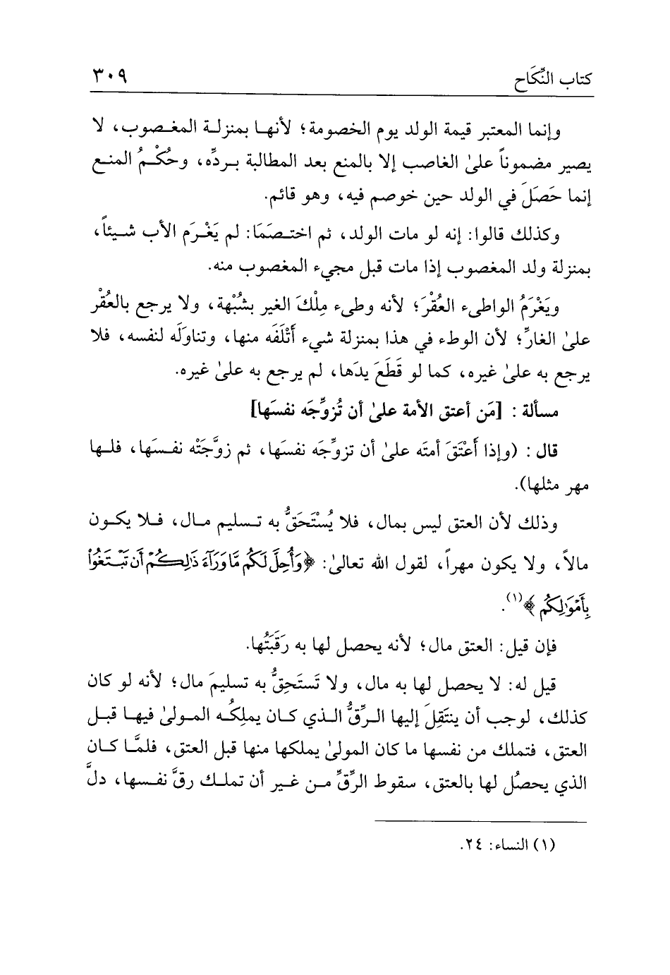 وذلك لأن العتق ليس بمال، فلا يستحق به تسليم مال، فلا يكون مالًا، ولا يكون مهرًا، لقول الله تعالى:} وأحل لكم ما وراء ذلكم أن تبتغوا بأموالكم {.