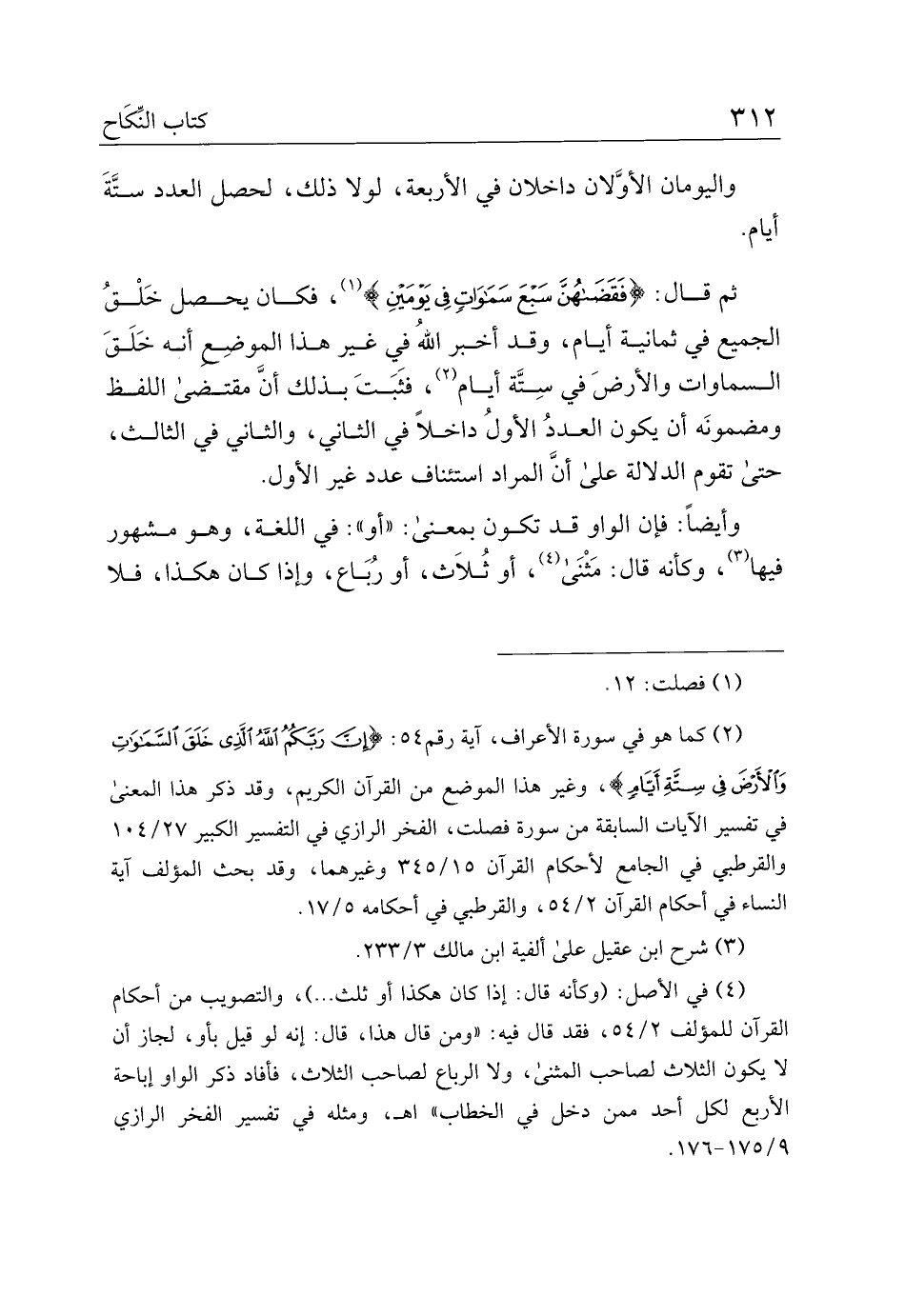 ثم قال:} فقضاهن سبع سموات في يومين {، فكان يحصل خلق الجميع في ثمانية أيام، وقد أخبر الله في غير هذا الموضع أنه خلق السماوات والأرض في ستة أيام، فثبت بذلك أن مقتضى اللفظ ومضمونه أن يكون العدد الأول داخلًا في الثاني، والثاني في الثالث، حتى تقوم الدلالة على أن المراد استئناف عدد غير الأول.