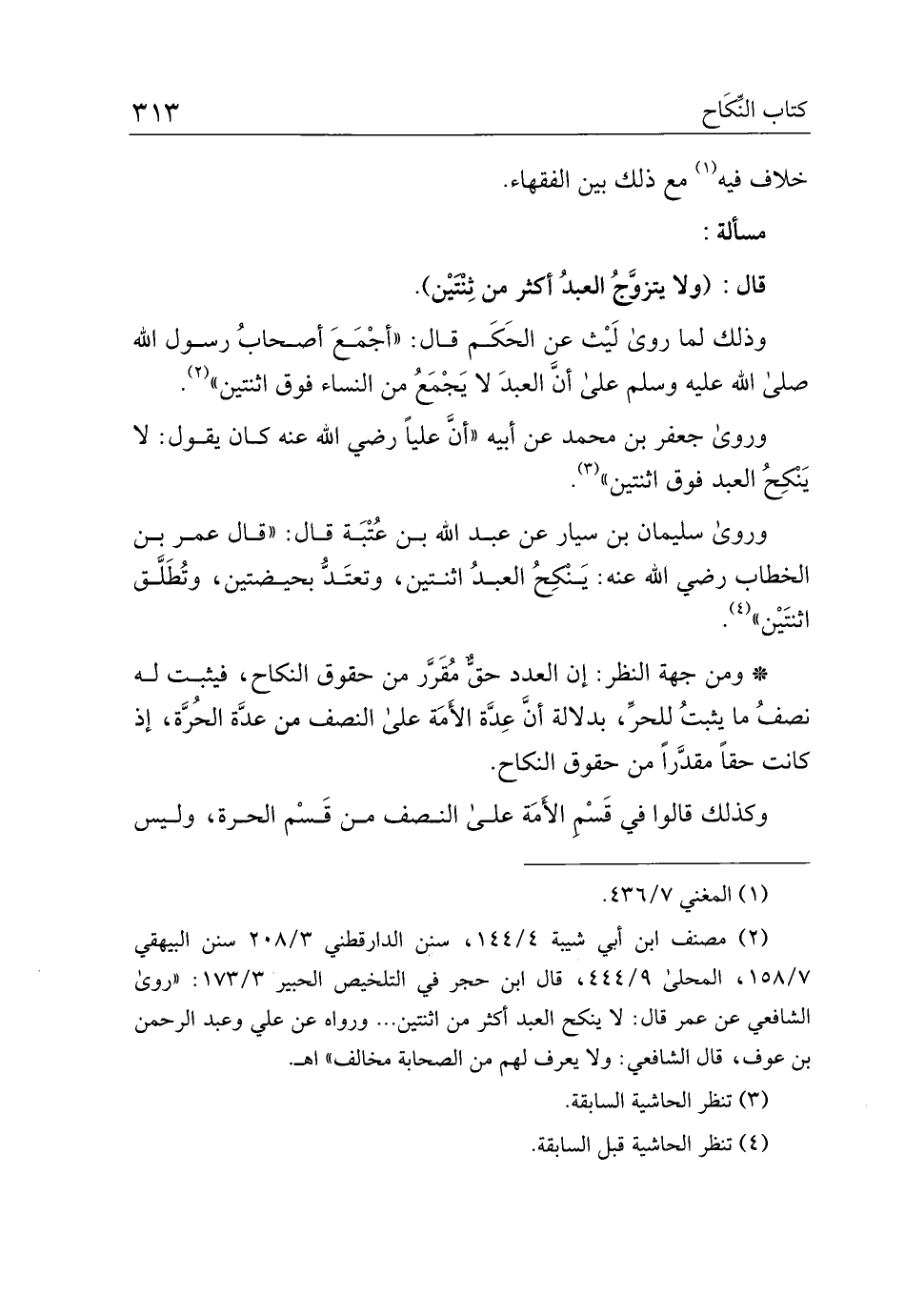 وروى سليمان بن سير عن عبد الله بن عتبة قال: "قال عمر بن الخطاب رضي الله عنه: ينكح العبد اثنتين، وتعتد بحيضتين، وتطلق اثنتين".