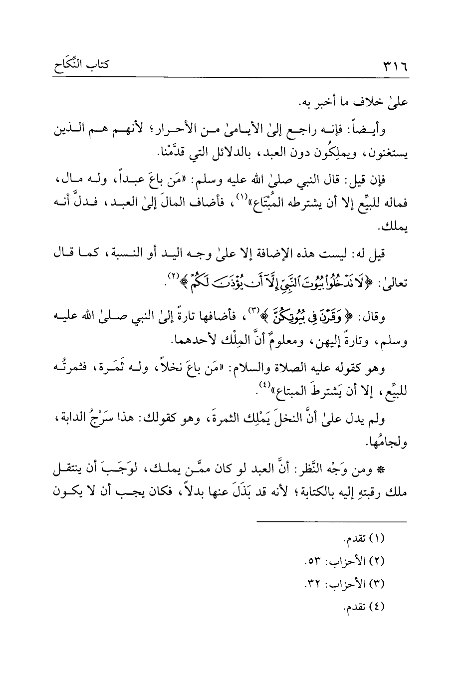 وقال:} وقرن في بيوتكن {، فأضافها تارة إلى النبي صلى الله عليه وسلم، وتارة إليهن، ومعلوم أن الملك لأحدهما.