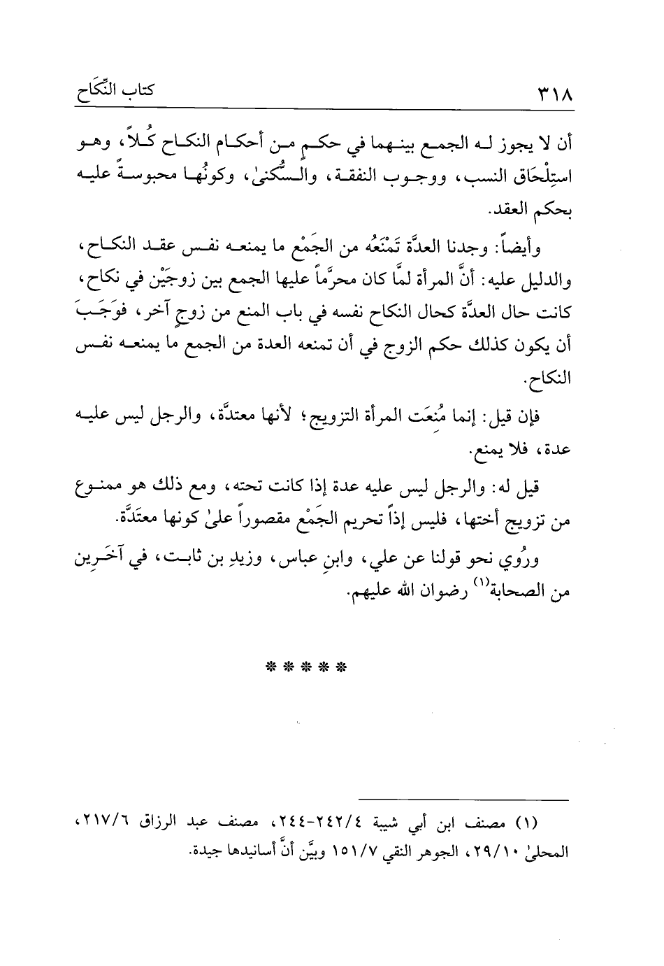 وأيضًا: وجدنا العدة تمنعه من الجمع ما يمنعه نفس عقد النكاح، والدليل عليه: أن المرأة لما كان محرمًا عليها الجمع بين زوجين في نكاح، كانت حال العدة كحال النكاح نفسه في باب المنع من زوج آخر، فوجب أن يكون كذلك حكم الزوج في أن تمنعه العدة من الجمع ما يمنعه نفس النكاح.