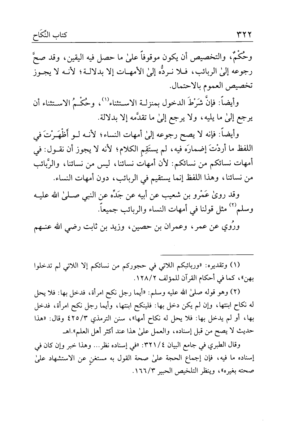 وحكم، والتخصيص أن يكون موقوفًا على ما صل فيه اليقين، وقد صح رجوعه إلى الربائب، فلا نرده إلى الأمهات إلا بدلالة؛ لأنه لا يجوز تخصيص العموم بالاحتمال.