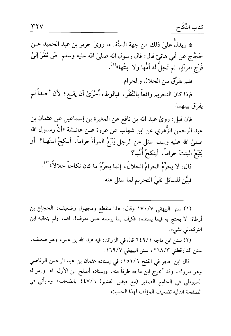 * ويدل على ذلك من جهة السنة: ما روى جرير بن عبد الحميد عن حجاج عن أبي هاني قال: قال رسول الله صلى الله عليه وسلم: من نظر إلى فرج امرأة، لم تحل له أمها ولا ابنتها".