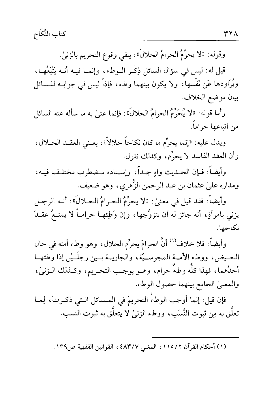 وأيضًا: فقد قيل في معنى: "لا يحرم الحرام الحلال": أنه الرجل يزني بامرأة، أنه جائز له أن يتزوجها، وإن وطئها حرامًا لا يمنع عقد نكاحها.