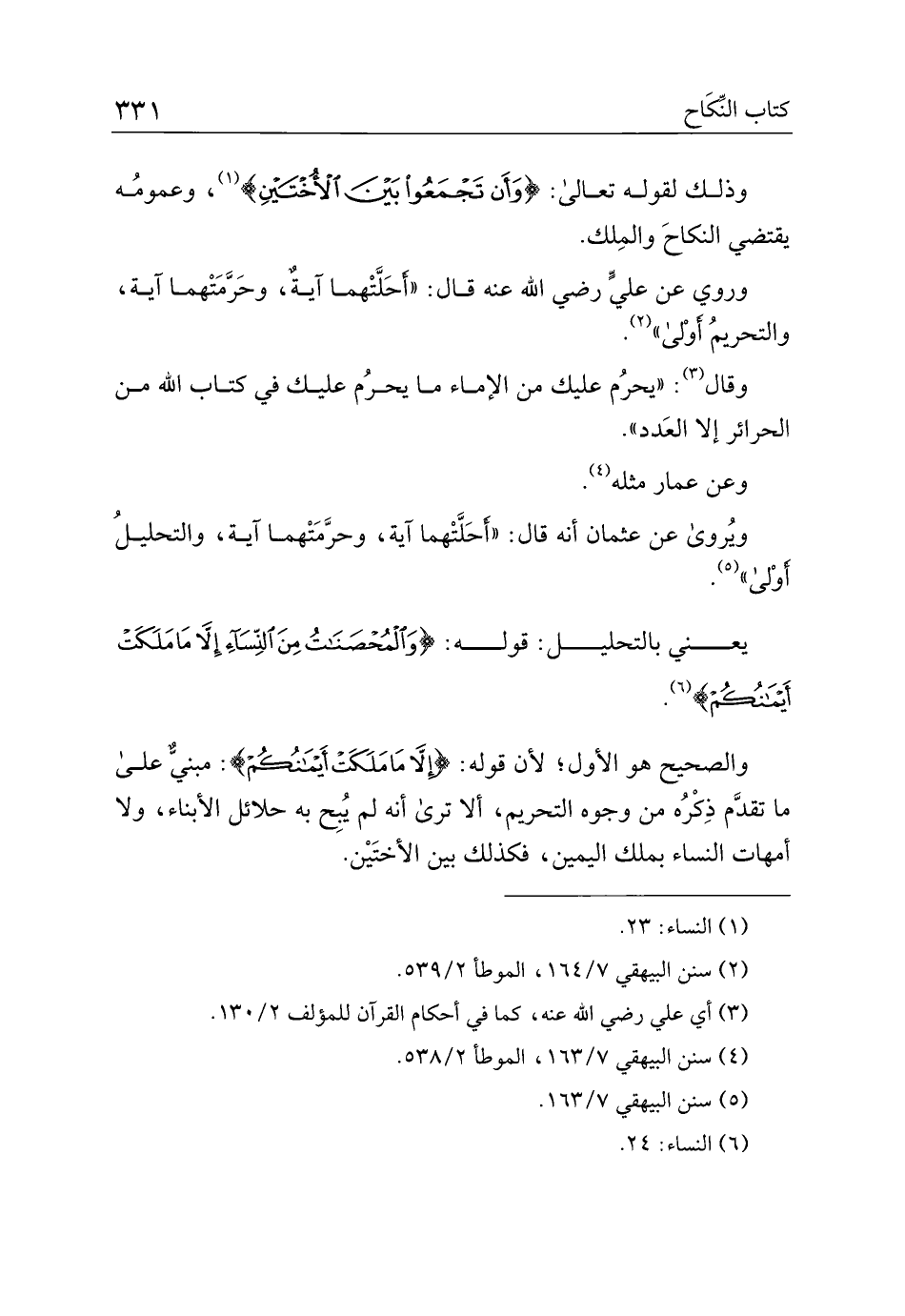 والصحيح هو الأول؛ لأن قوله:} إلا ما ملكت أيمانكم {: مبني على ما تقدم ذكره من وجوه التحريم، ألا ترى أنه لم يبح به حلائل الأبناء، ولا أمهات النساء بملك اليمين، فكذلك بين الأختين.