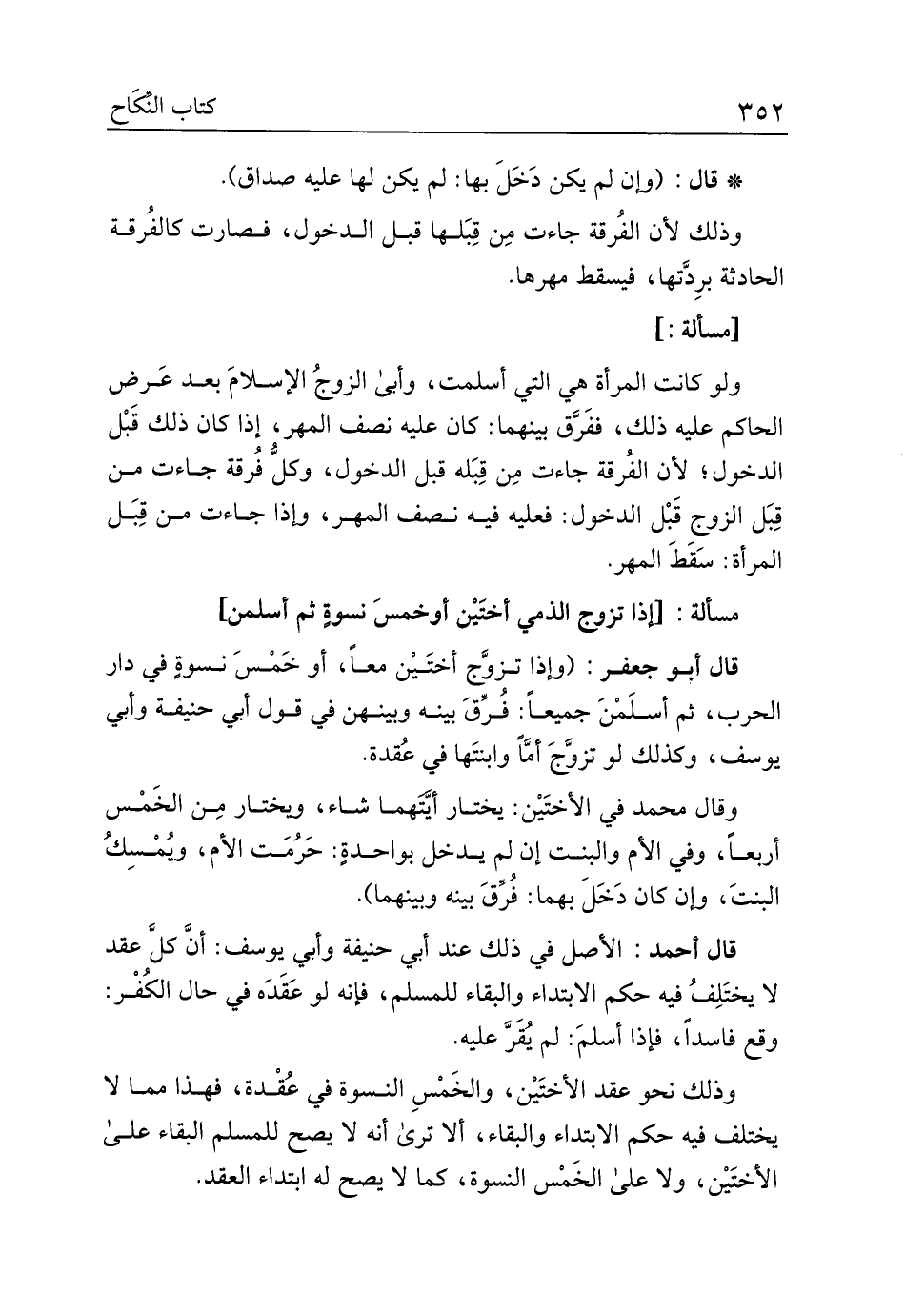 قال أبو جعفر: (وإذا تزوج أختين معا، أو خمس نسوة في دار الحرب، ثم أسلمن جميعا: فرق بينه وبينهن في قول أبي حنيفة وأبي يوسف، وكذلك لو تزوج أما وابنتها في عقدة.