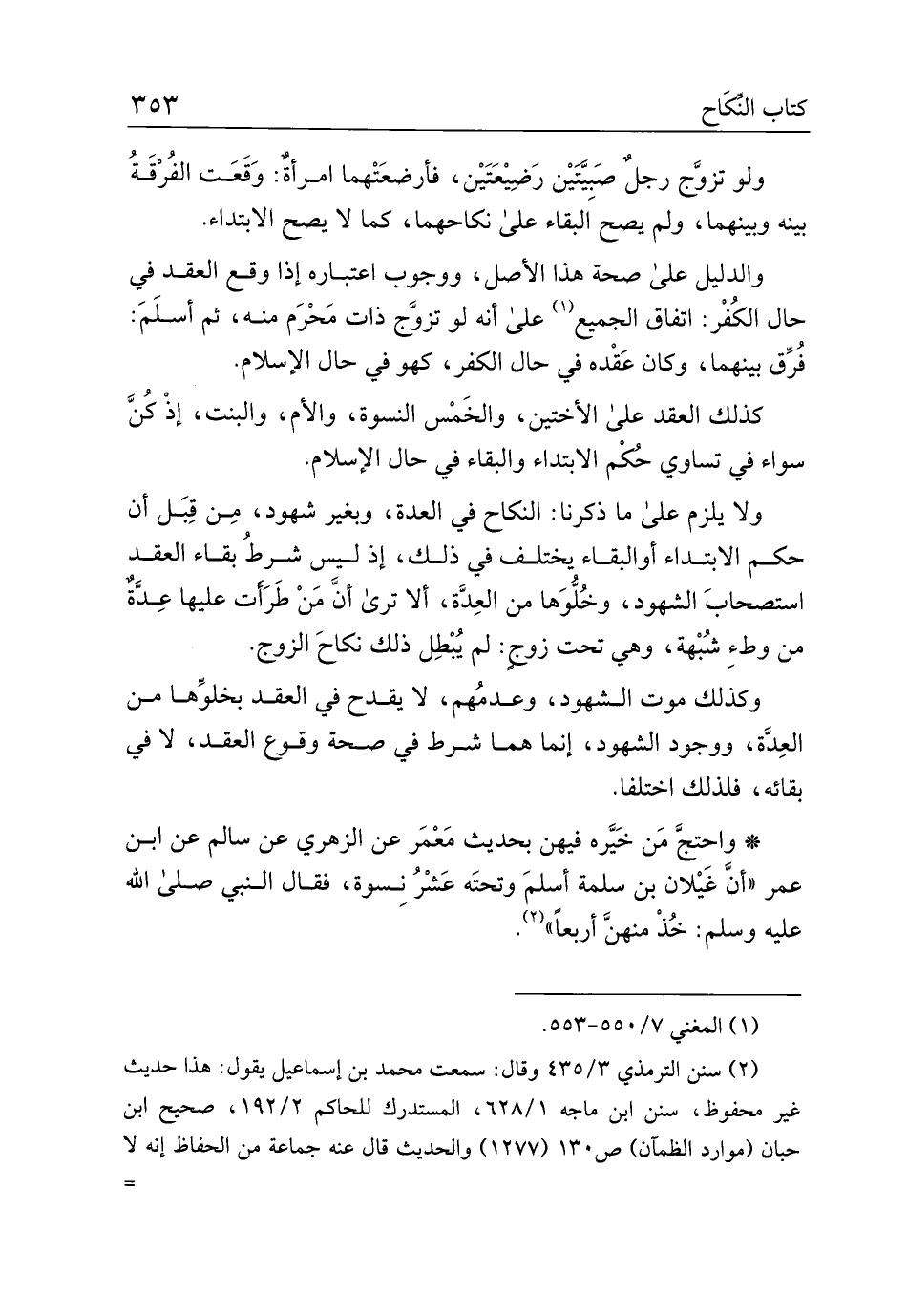 *واحتج من خيره فيهن بحديث معمر عن الزهري عن سالم عن ابن عمر "أن غيلان بن سلمة أسلم وتحته عشر نسوة، فقال النبي صلى الله عليه وسلم: خذ منهم أربعا".