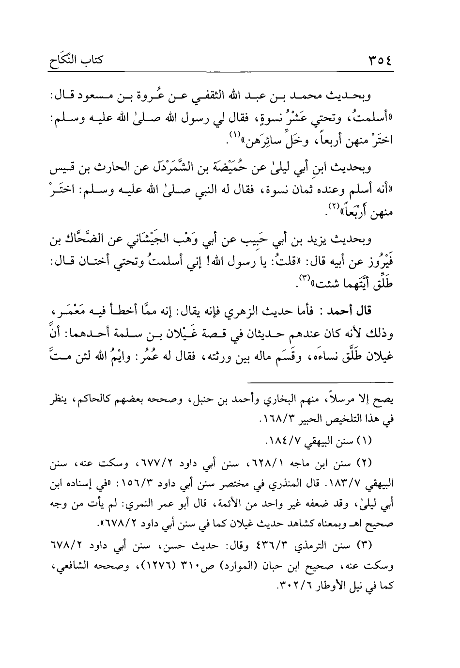 وبحديث ابن أبي ليلى عن حميضة بن الشمردل عن الحارث بن قيس "أنه أسلم وعنده ثمان نسوة، فقال له النبي صلى الله عليه وسلم: اختر منهم أربعا".