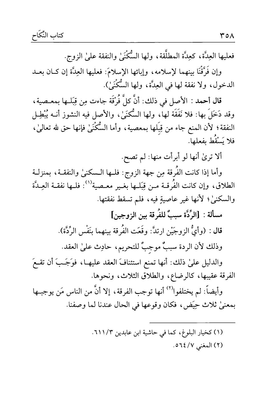 قال أحمد: الأصل في ذلك: أن كل فرقة جاءت من قبلها بمعصية، وقد دخل بها: فلا نفقة لها، ولها السكنى، والأصل فيه النشوز أنه يبطل النفقة؛ لأن المنع جاء من قبلها بمعصية، وأما السكنى فإنها حق لله تعالى، فلا يسقط بفعلها.
