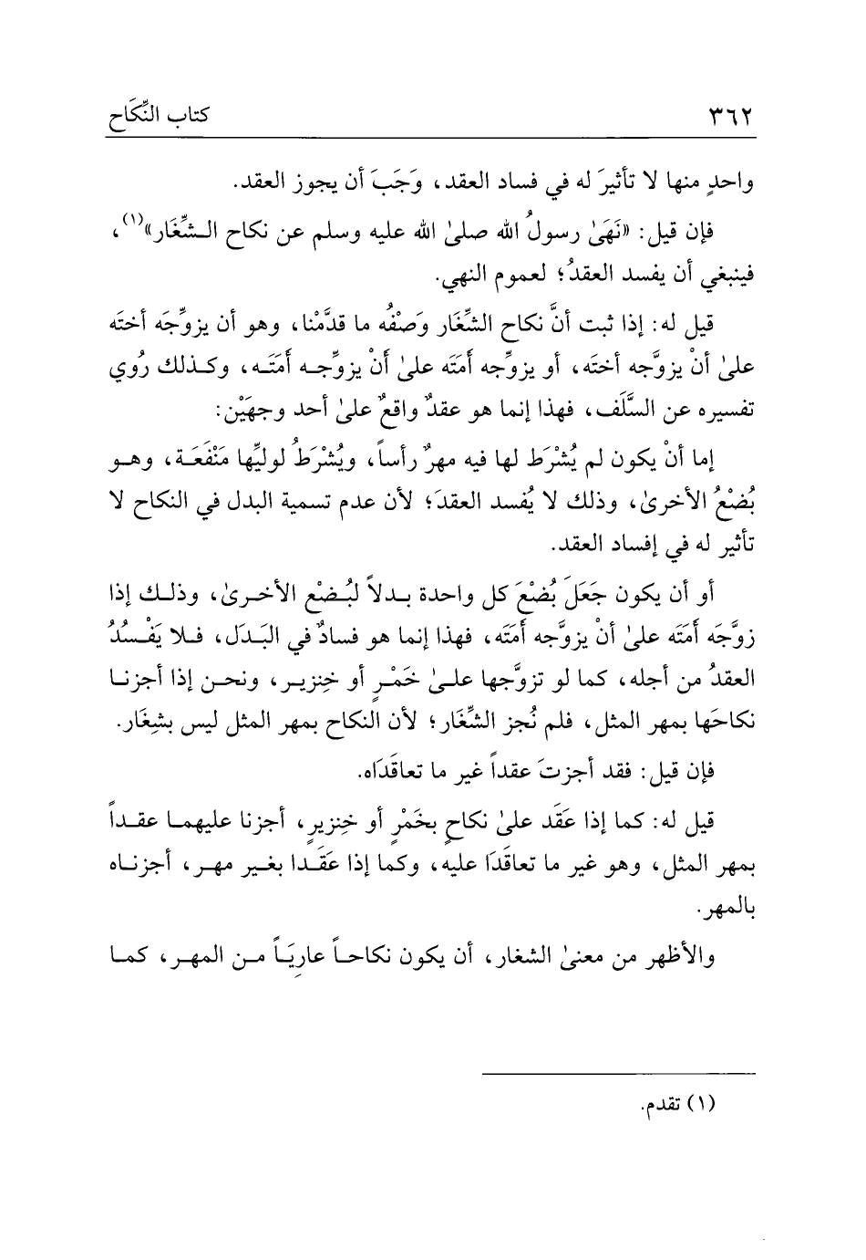 قيل له: إذا ثبت أن نكاح الشغار وصفه ما قدمنا، وهو أن يزوجه أخته على أن يزوجه أخته، أو يزوجه أمته على أن يزوجه أمته، وكذلك روي تفسيره عن السلف، فهذا إنما هو عقد واقع على أحد وجهين:
