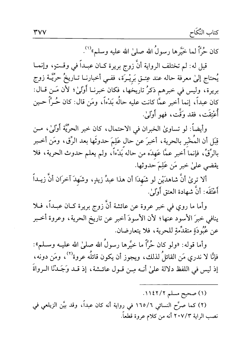 وأما قوله: "ولو كان حرا ما خيرها رسول الله صلى الله عليه وسلم": فإنا لا ندري من القائل لذلك، ويجوز أن يكون قائله عروة، ومن دونه، إذ ليس في اللفظ دلالة على أنه من قول عائشة، إذ قد وجدنا الرواة