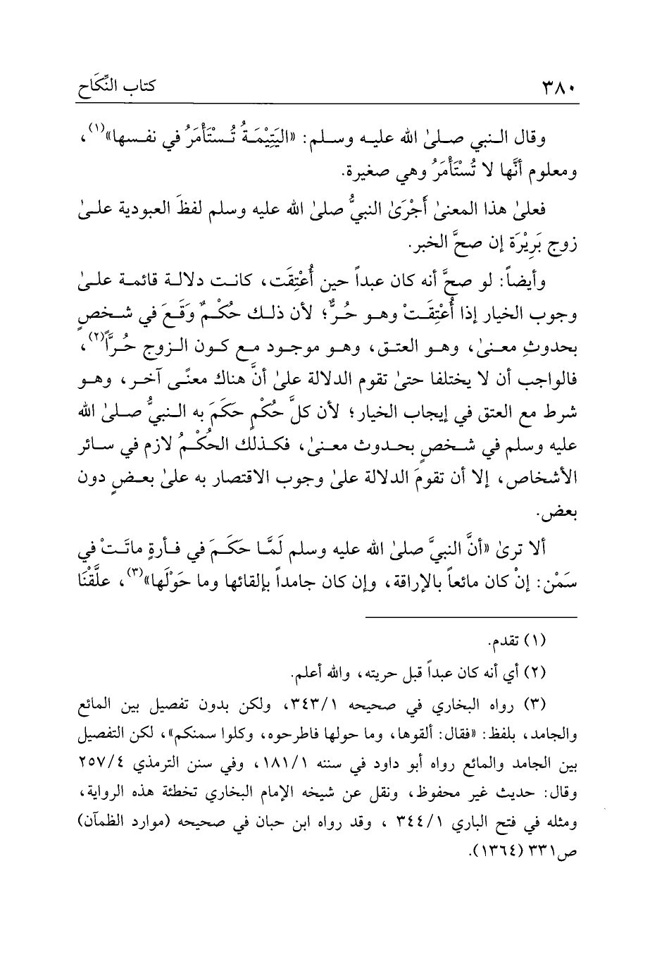 وأيضا: لو صح أنه كان عبدا حين أعتقت، كانت دلالة قائمة على وجوب الخيار إذا أعتقت وهو حر؛ لأن ذلك حكم وقع في شخص بحدوث معنى، وهو العتق، وهو موجود مع كون الزوج حرا، فالواجب أن لا يختلفا حتى تقول الدلالة على أن هناك معنى آخر، وهو شرط مع العتق في إيجاب الخيار؛ لأن كل حكم حكم به النبي صلى الله عليه وسلم في شخص بحدوث معني، فكذلك الحكم لازم في سائر الأشخاص، إلا أن تقوم الدلالة على وجوب الاقتصار به على بعض دون بعض.