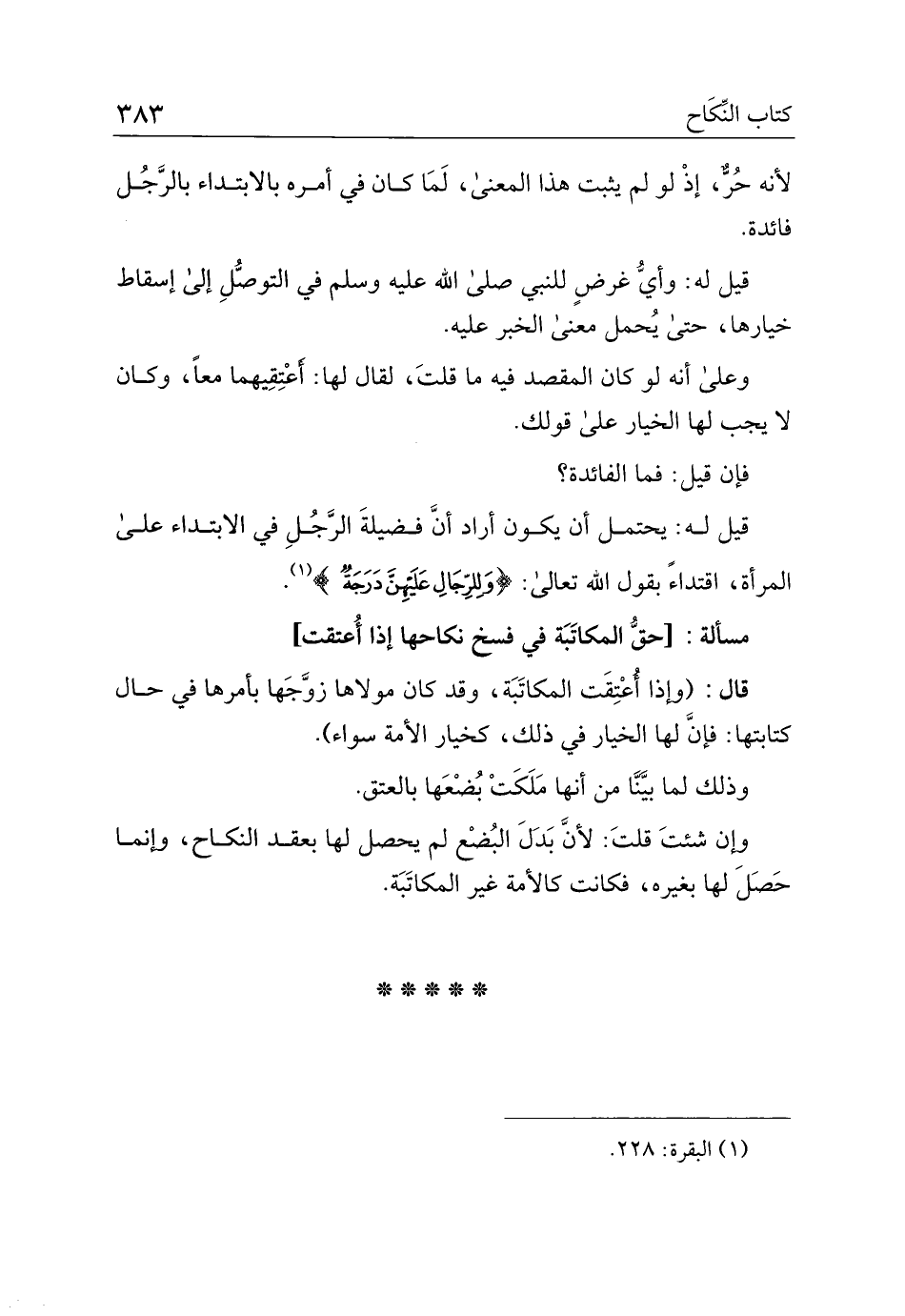 مسألة: [حق المكاتبة في فسخ نكاحها إذا أعتقت}