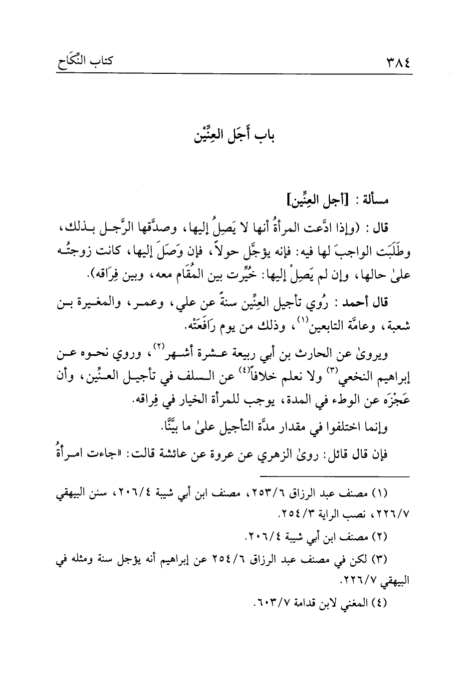 قال أحمد: روي تأجيل العنين سنة عن علي، وعمر، والمغيرة بن شعبة، وعامة التابعين، وذلك من يوم رافعته.