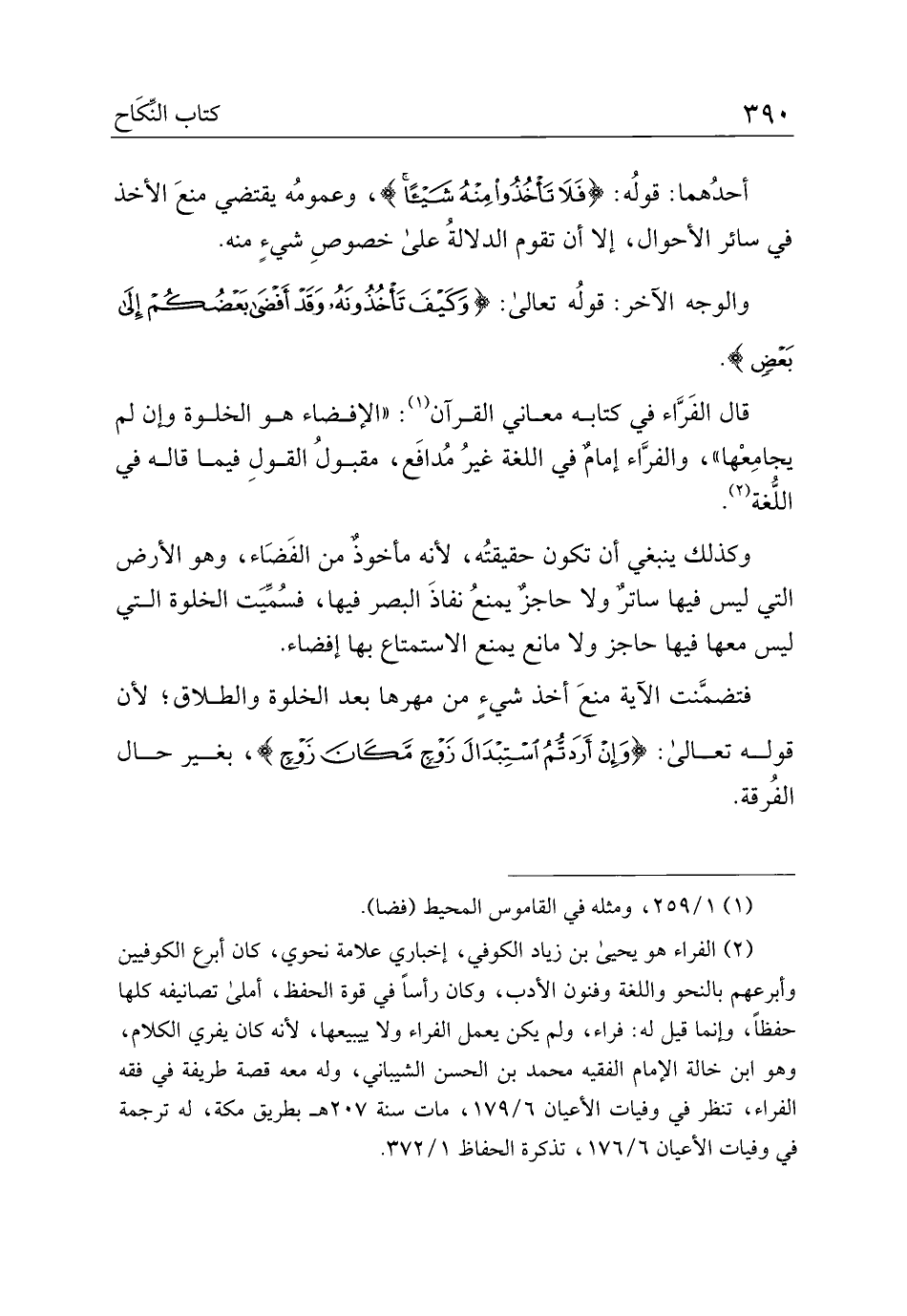 قال الفراء في كتابه معاني القرآن: "الإفضاء هو الخلوة وإن لم يجامعها"، والفراء إمام في اللغة غير مدافع، مقبول القول فيما قاله في اللغة".