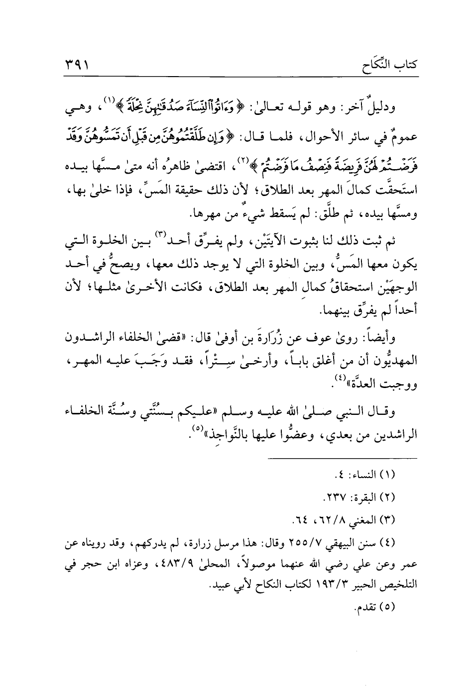 ودليل آخر: وهو قوله تعالى: {وأتوا النساء صدقاتهن نحلة}، وهي عموم في سائر الأحوال، فلما قال: {وإن طلقتموهن من قبل أن تمسوهن وقد فرضتم لهن فريضة فنصف ما فرضتم}، اقتضى ظاهره أنه متى مسها بيده استحق كمال المهر بعد الطلاق؛ لأن ذلك حقيقة المس، فإذا خلى بها، ومسها بيده، ثم طلق: لم يسقط شيء من مهرها.