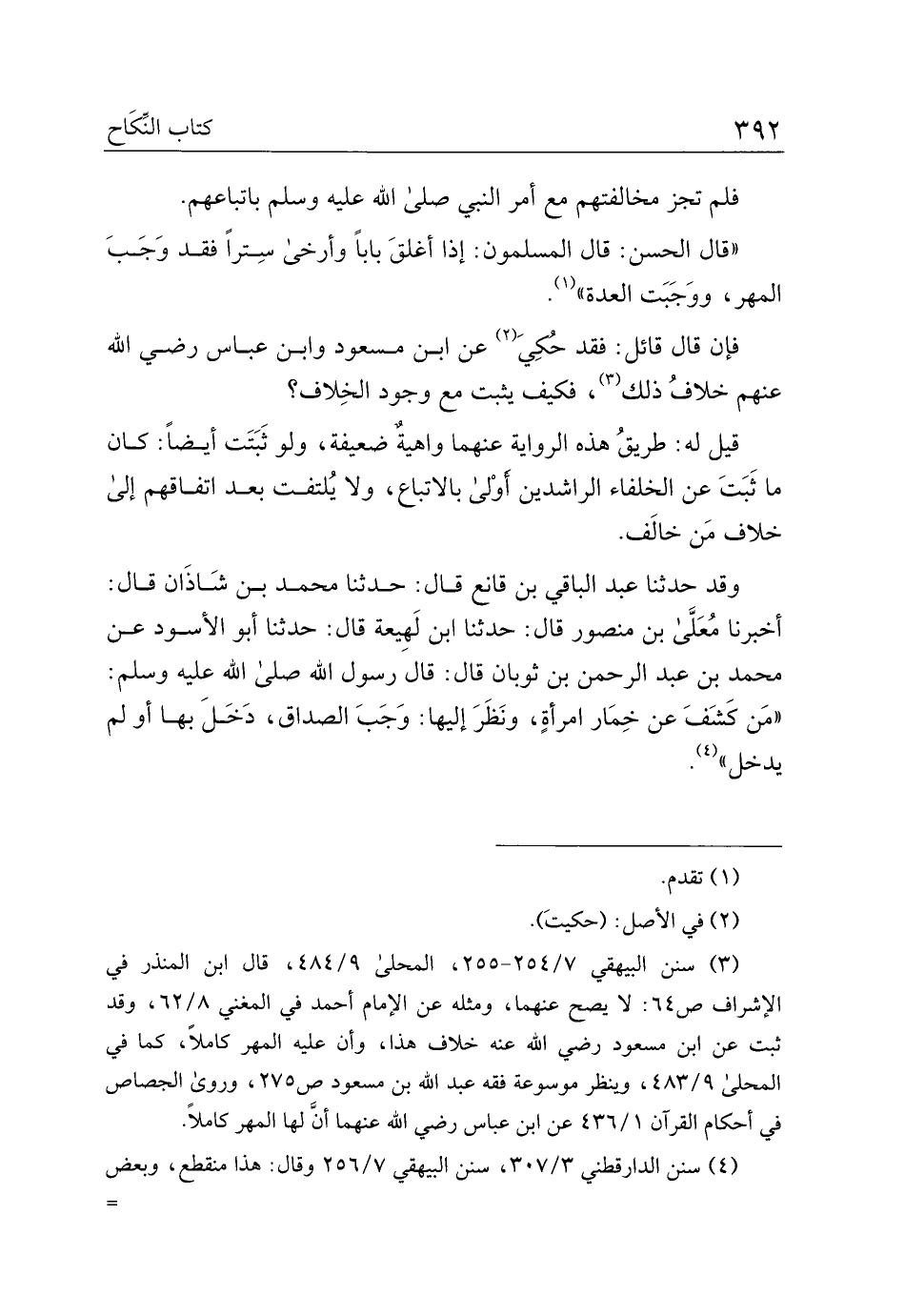 وقد حدثنا عبد الباقي بن قانع قال: حدثننا محمد بن شاذان قال: أخبرنا معلى بن منصور قال: حدثنا ابن لهيعة قال: حدثنا أبو الأسود عن محمد بن عبد الرحمن بن ثوبان قال: قال رسول الله صلى الله عليه وسلم: "من كشف عن خمار امرأة، ونظر إليها: وجب الصداق، دخل بها أو لم يدخل".