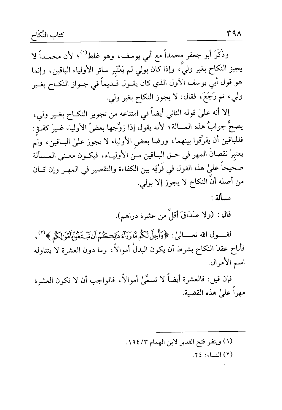 إلا أنه على قوله الثاني أيضا في امتناعه من تجويز النكاح بغير ولي، يصح جواب هذه المسألة؛ لأنه يقول إذا زوجها بعض الأولياء غير كفؤ: فللباقين أن يفرقوا بينهما، ورضا بعض الأولياء لا يجوز على الباقين، ولم يعتبر نقصان المهر في حق الباقين من الأولياء، فيكون معنى المسألة صحيحا على هذا القول في فرقه بين الكفاءة والتقصير في المهر وإن كان من أصله أن النكاح لا يجوز إلا بولي.