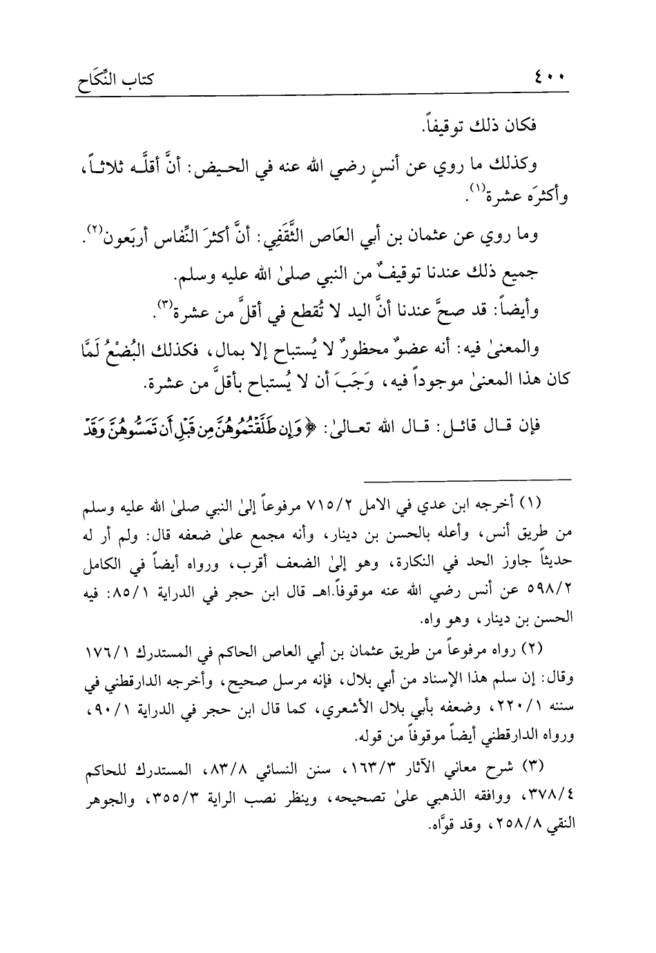 وكذلك ما روي عن أنس رضي الله عنه في الحيض: أن أقله ثلاثا، وأكثره عشرة.