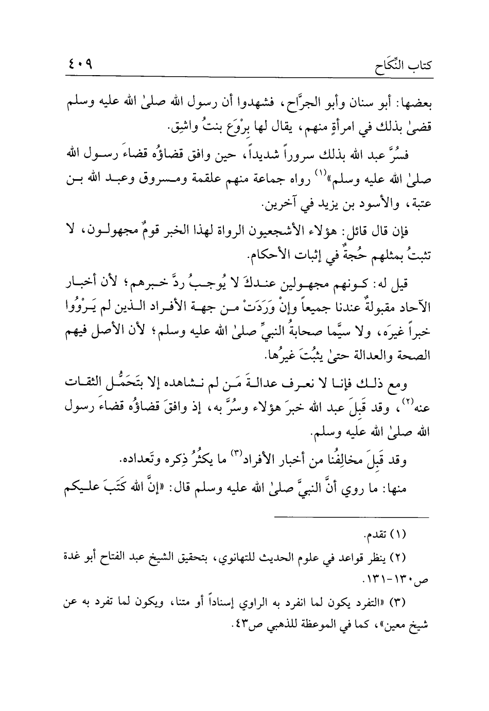 ومع ذلك فإنا لا نعرف عدالة من لم نشاهده إلا بتحمل الثقات عنه، وقد قبل عبد الله خبر هؤلاء وسر به، إذ وافق قضاؤه قضاء رسول الله صلى الله عليه وسلم.
