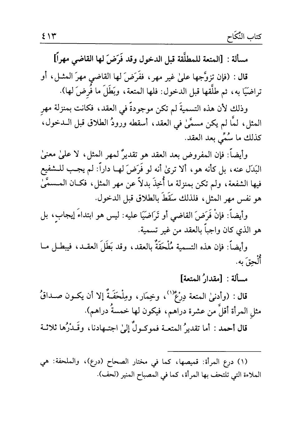 قال أحمد: أما تقدير المتعة فموكول إلى اجتهادنا، وقدرها ثلاثة