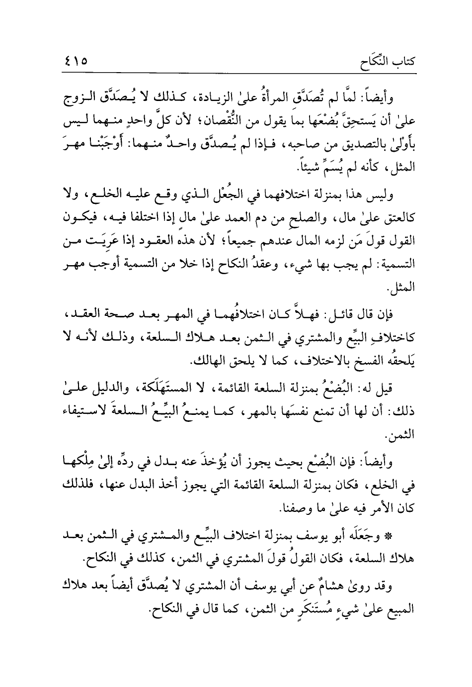 *وجعله أبو يوسف بمنزلة اختلاف البيع والمشتري في الثمن بعد هلاك السلعة، فكان القول قول المشتري في الثمن، كذلك النكاح.