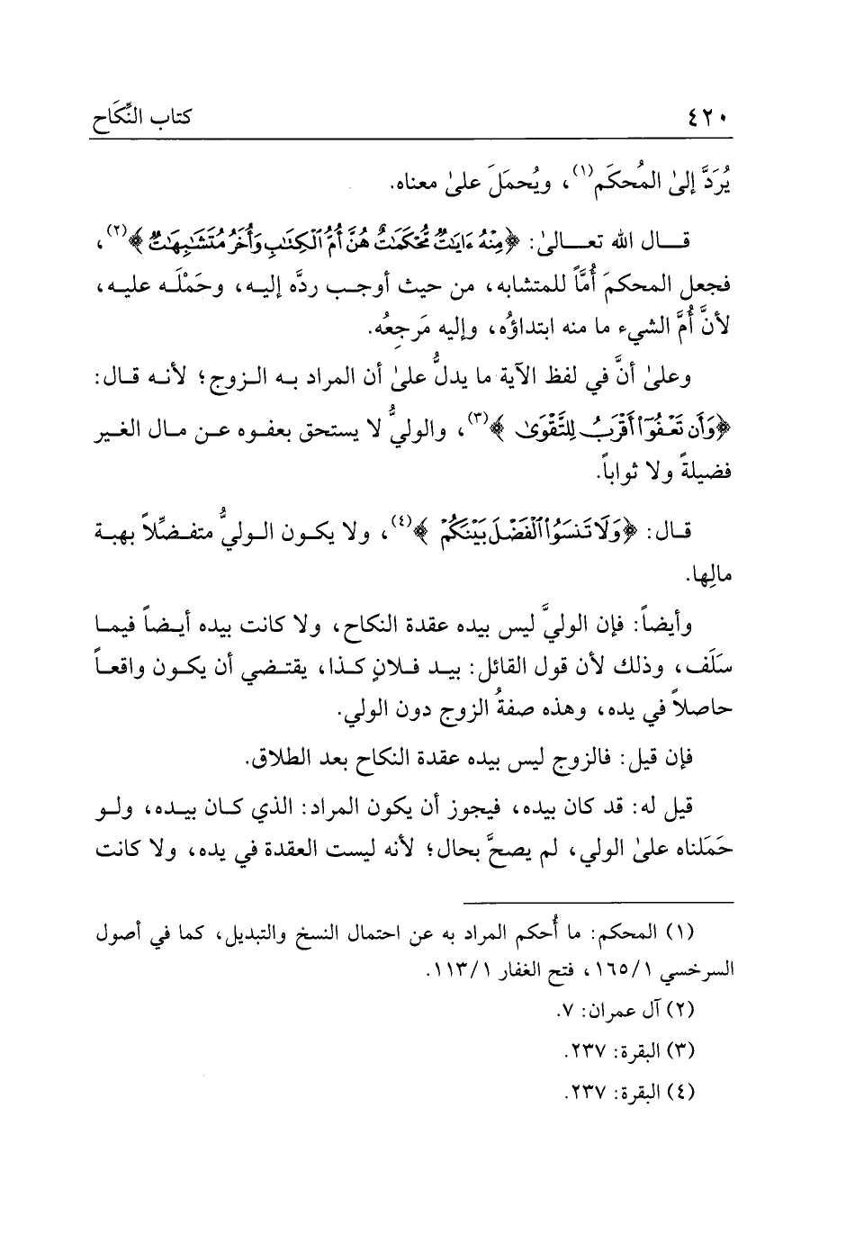 قال الله تعالى: {منه آيات محكمات هن أم الكتاب وأخر متشابهات}، فجعل المحكم أما للمتشابه، كم حيث أوجب رده إليه، وحمله عليه، لأن أم الشيء ما منه ابتداؤه، وإليه مرجعه.