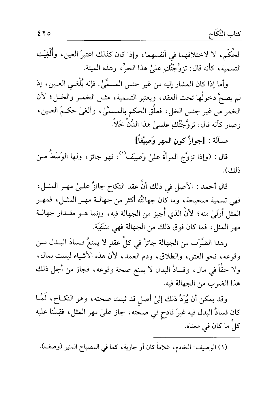 قال: (وإذا تزوج المرأة على وصيف: فهو جائز، ولها الوسط من ذلك).