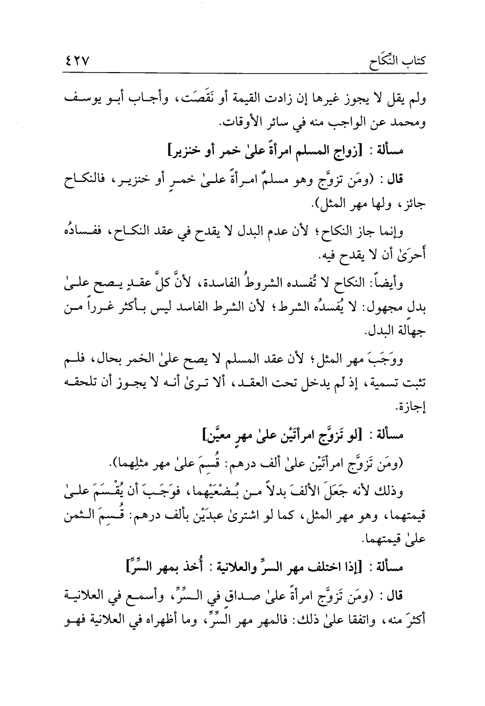 قال: (ومن تزوج وهو مسلم امرأة على خمر أو خنزير، فالنكاح جائز، ولها مهر المثل).